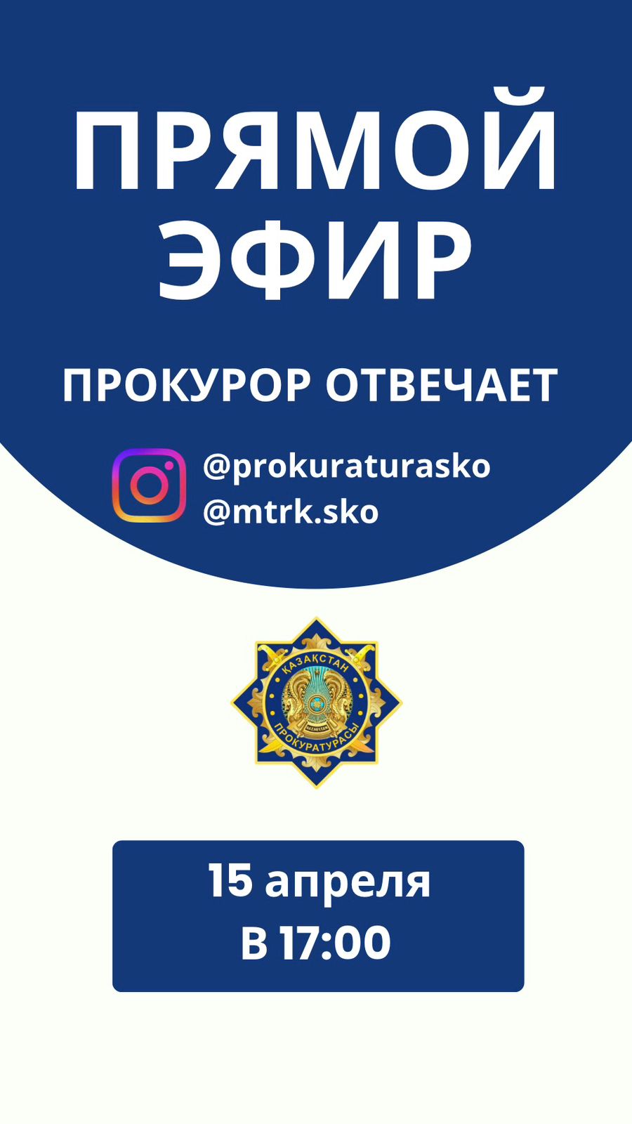«Заң мен  тәртіп» Тұжырымдамасын  іске асыру аясында 2026 жылғы 15 сәуірде сағат 17:00-де облыс прокуратурасының Instagram-дағы ресми парақшасында @prokuraturasko: «Үкімдер қалай орындалады» тақырыбына тікелей эфир өтеді..