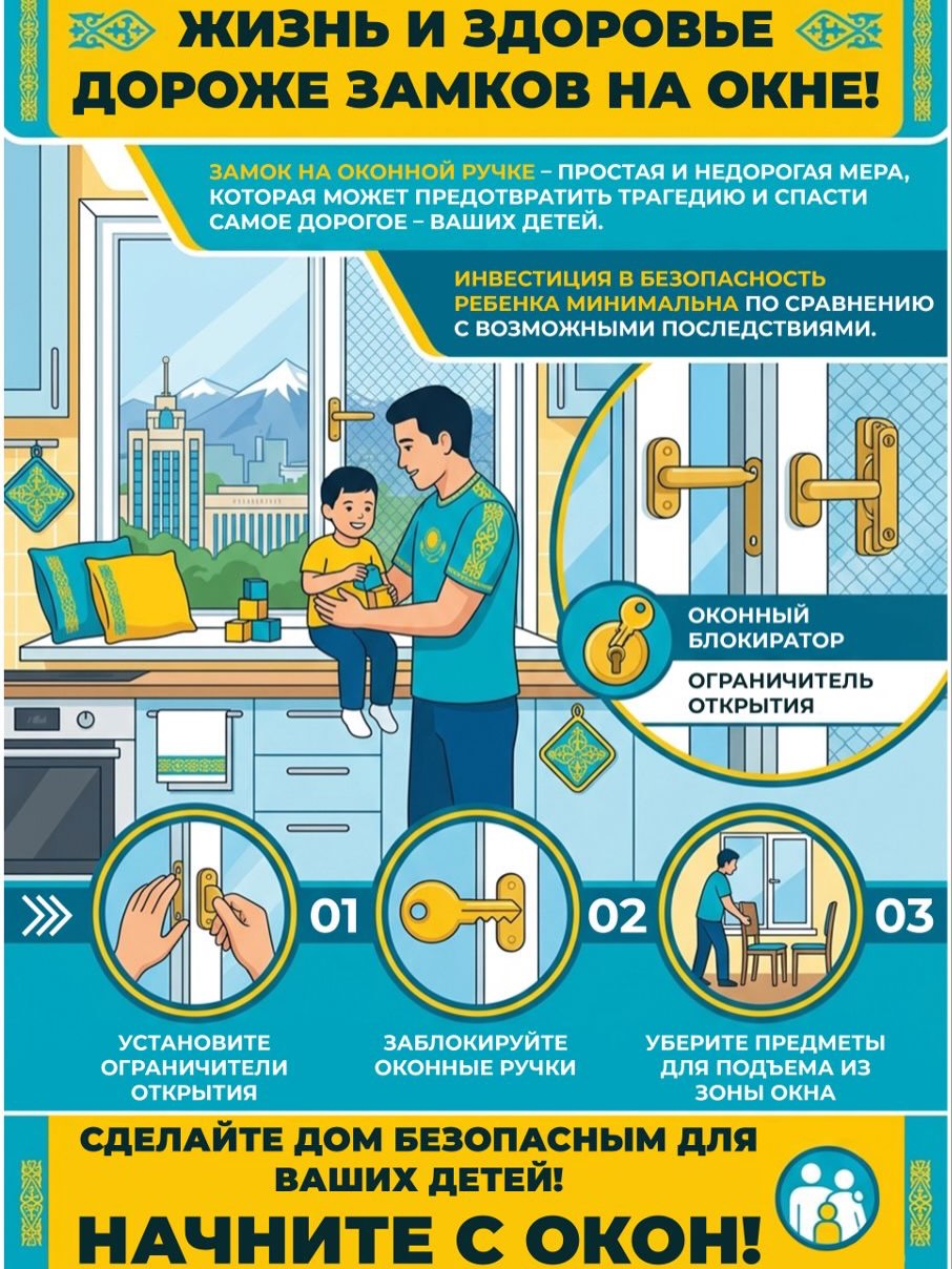 Үй басқарушыларымен және белсенді тұрғындармен бірлесіп, терезелерге арнайы құлыптар орнату және қауіпсіздік ережелері жазылған ақпараттық парақшаларды тарату жұмыстары ұйымдастырылады.
