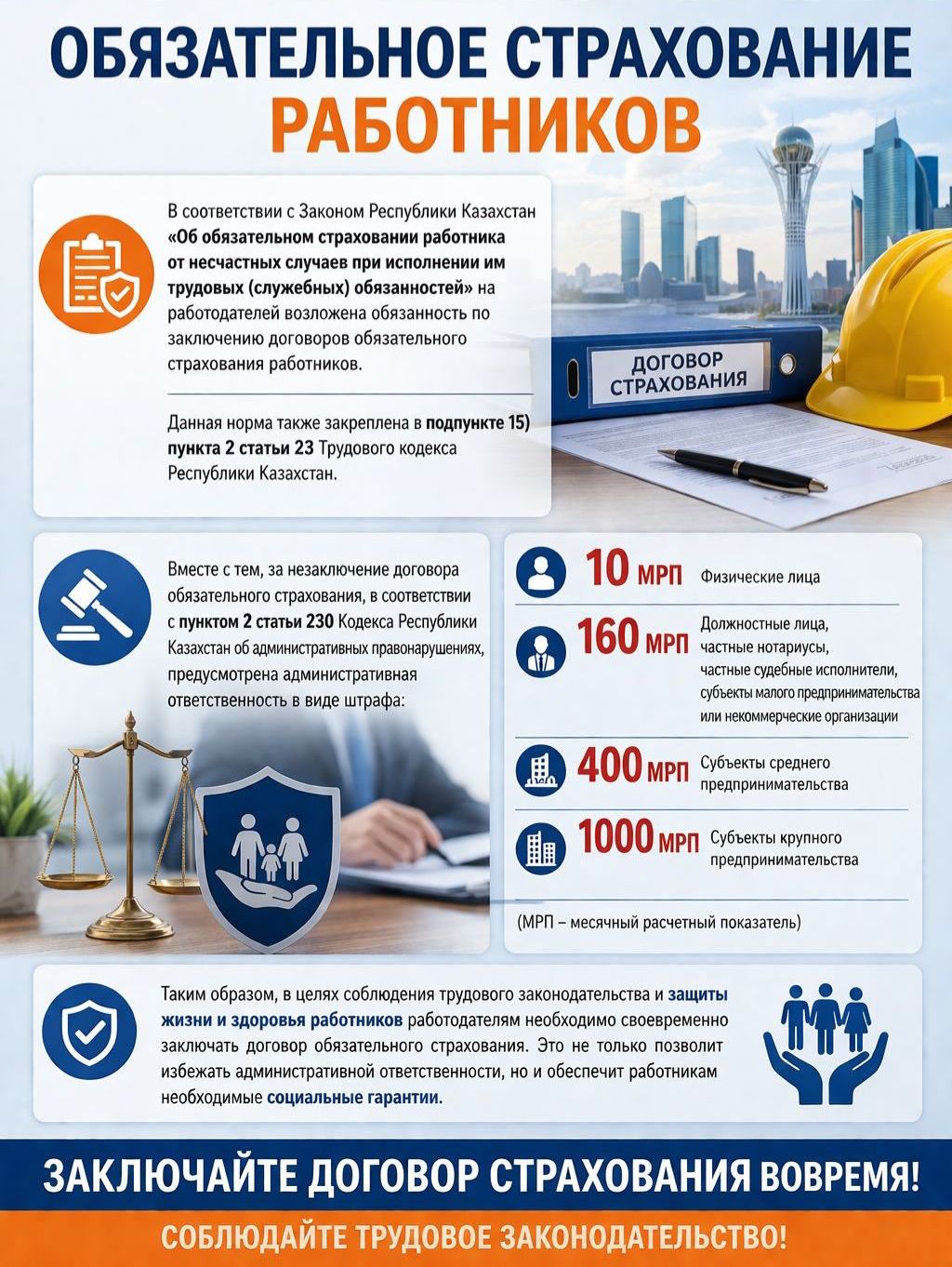 Осыған байланысты, еңбек заңнамасын сақтау және қызметкерлердің өмірі мен денсаулығын қорғау мақсатында жұмыс берушілерге міндетті сақтандыру шарттарын уақытылы жасасу қажет. Бұл әкімшілік жауапкершіліктің алдын алып қана қоймай, қызметкерлерге әлеуметтік кепілдіктерді қамтамасыз етеді.