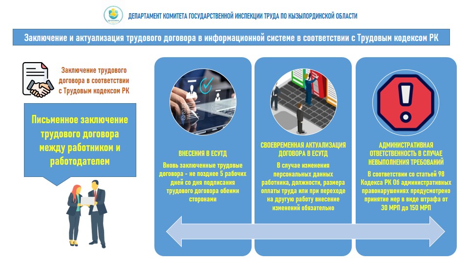 «Әкімшілік құқық бұзушылық туралы» Кодексінің (бұдан әрі -ӘҚБтК) 98-бабы 1-1-тармағына сәйкес жұмыс берушінің қызметкермен еңбек шартын жасасу және тоқтату, оған енгізілетін өзгерістер және (немесе) толықтырулар туралы ақпараттарды ЕШЕБЖ-ға енгізу тәртібі келесі түрлерде жасалғанда бұзушылығы үшін – лауазымды тұлғаларға 30 АЕК мөлшерінде айыппұл салуға алып келеді:
