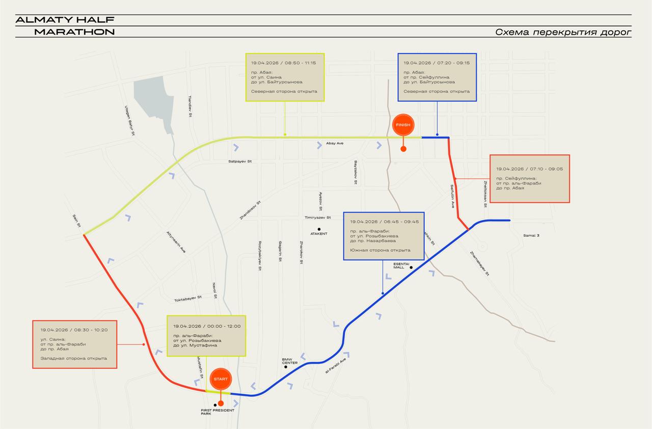 Жарыс таңғы сағат 07:00-де Тұңғыш Президент саябағында басталады. Әл-Фараби даңғылының солтүстік жағымен Розыбакиев көшесінен Мұстафин көшесіне дейінгі жол бөлігі 19 сәуір күні сағат 00:00-ден 12:00-ге дейін жабылады. Оңтүстік жағы ашық болады.
