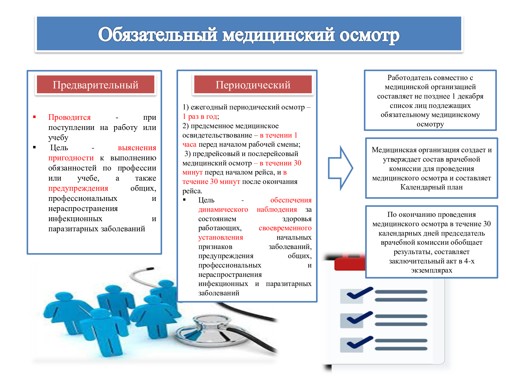Алдын ала және мерзімдік медициналық тексерулер Қазақстан Республикасы Денсаулық сақтау министрінің м.а. 2020 жылғы 15 қазандағы № ҚР ДСМ-131/2020 бұйрығына сәйкес жүргізіледі. Аталған бұйрықта Міндетті медициналық қарап-тексерулерге жататын адамдардың нысаналы топтарын, сондай-ақ оларды жүргізу тәртібі мен мерзімділігін, зертханалық және функционалдық зерттеулердің көлемін, медициналық қарсы көрсетілімдерді, зиянды және (немесе) қауіпті өндірістік факторлардың, жұмысқа орналасқан кезде орындау кезінде міндетті алдын ала медициналық қарап-тексерулер және мерзімдік міндетті медициналық қарап-тексерулер жүргізілетін кәсіптер мен жұмыстардың тізбесін және “Алдын ала міндетті медициналық қарап-тексерулерден өткізу” мемлекеттік қызметін көрсету қағидалары бекітілген.