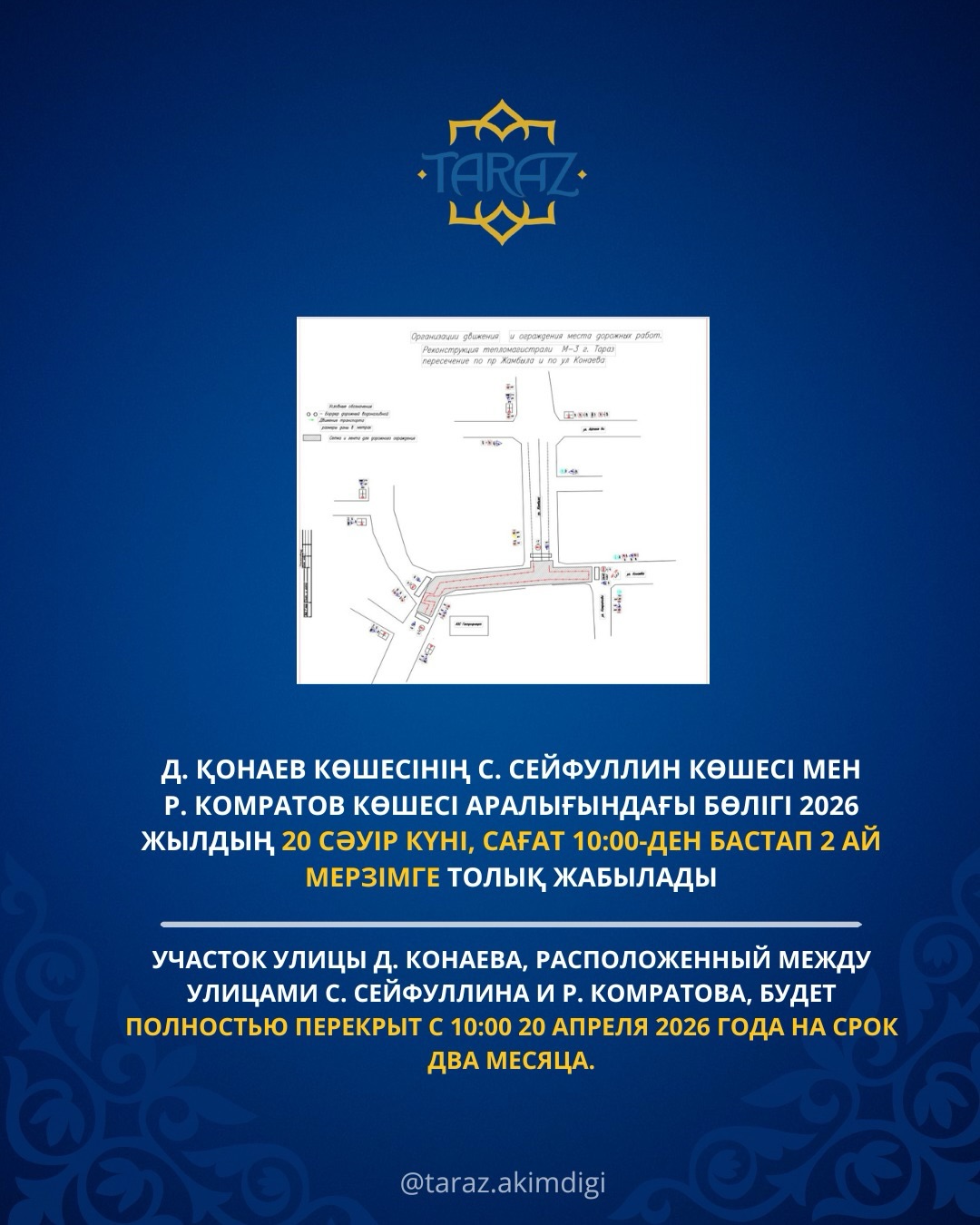 «Тараз қаласы Жамбыл даңғылы, Қонаев, Сейфуллин көшелерінің бойындағы ТК-301-ден ТК-308-ге дейінгі М-3 жылу магистралін қайта жаңғырту» жұмыс жобасына сәйкес, құрылыс-монтаждау жұмыстарының жүргізілуіне байланысты, Д. Қонаев көшесінің С. Сейфуллин көшесі мен Р. Комратов көшесі аралығындағы бөлігі 2026 жылдың 20 сәуір күні, сағат 10:00-ден бастап 2 ай мерзімге толығымен жабылып, барлық көлік қозғалысына тыйым салынады.