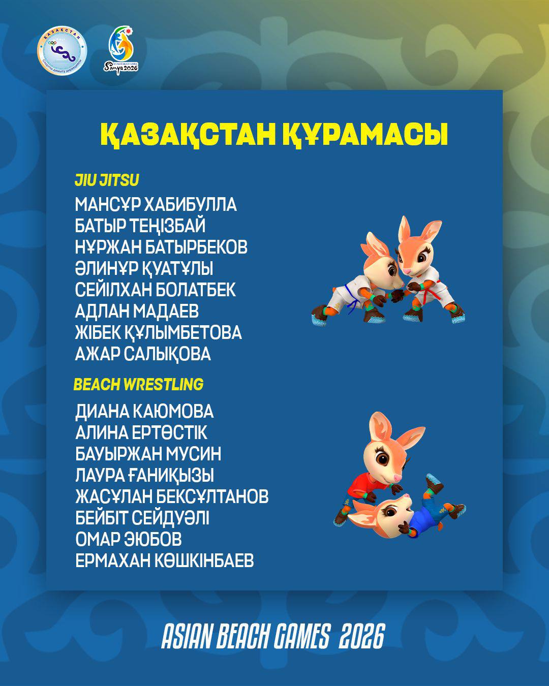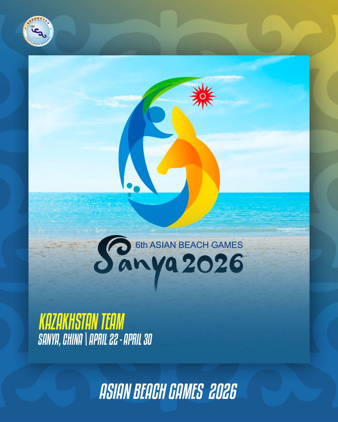 2026 жылғы 22–30 сәуір аралығында Қытайдың Санья қаласында (Хайнань аралы) VI Азия жағажай ойындары өтеді