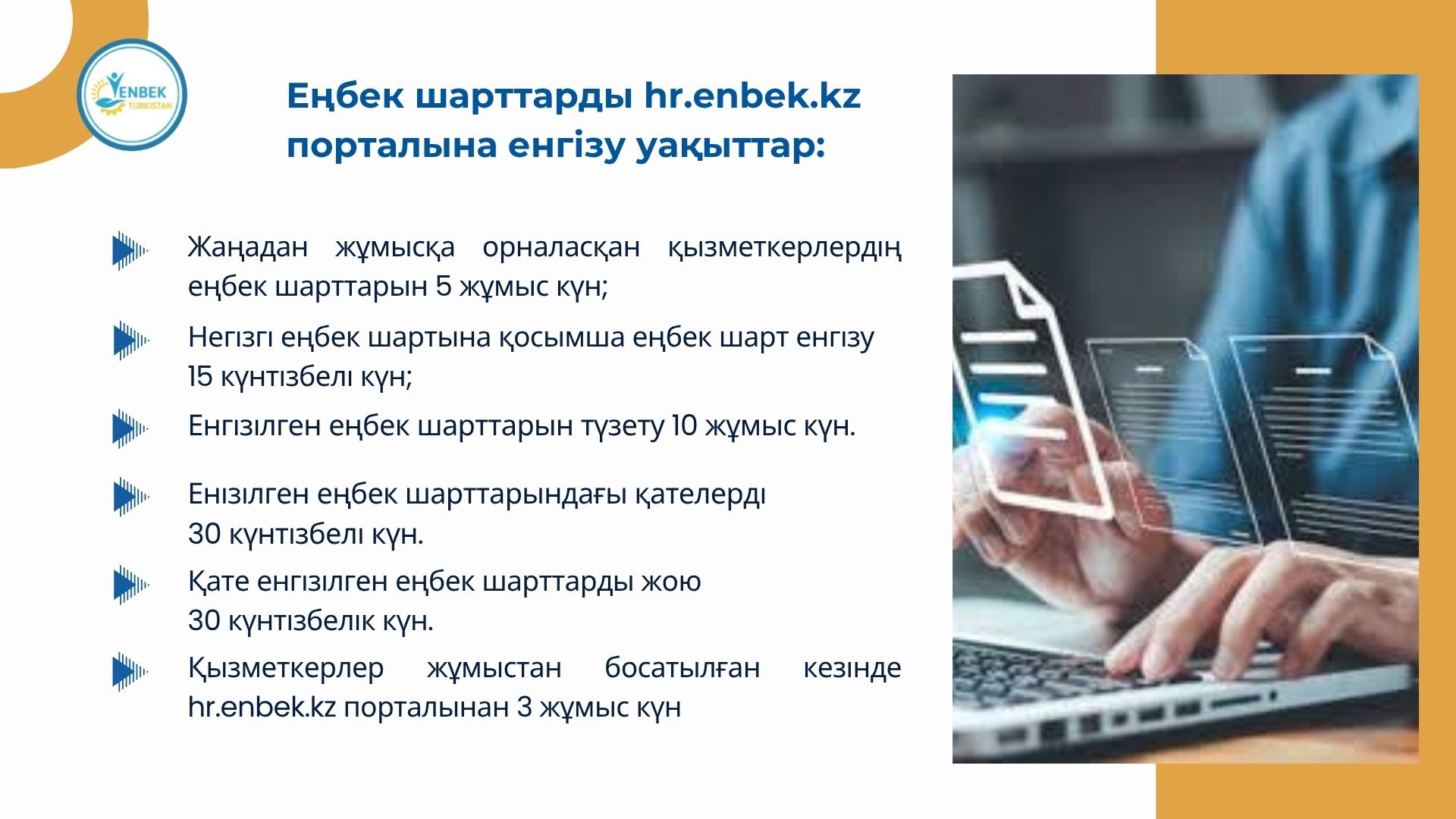 Қазақстан Республикасының еңбек заңнамасына сәйкес, әрбір жұмыс беруші қызметкерлерімен жасалған еңбек шарттарын Еңбек шарттарын есепке алудың бірыңғай жүйесіне (ЕШЕАБЖ) міндетті түрде енгізуге тиіс.