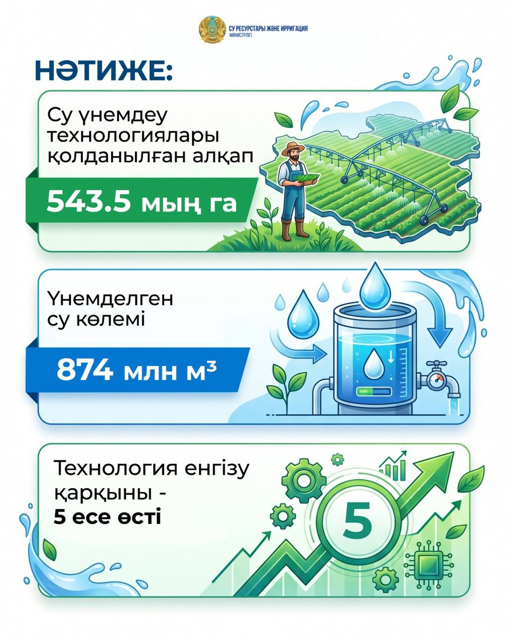 Қабылданған шаралар қазірдің өзінде нәтижесін беруде. Мемлекеттік қолдау Қазақстанда су үнемдеу технологияларын енгізу қарқынын бес есеге жеделдетуге мүмкіндік берді. 2025 жылдың қорытындысы бойынша мұндай технологиялар қолданылған алқап көлемі 543,5 мың гектарды құрап, 874 млн текше метр су үнемдеуге мүмкіндік берді.