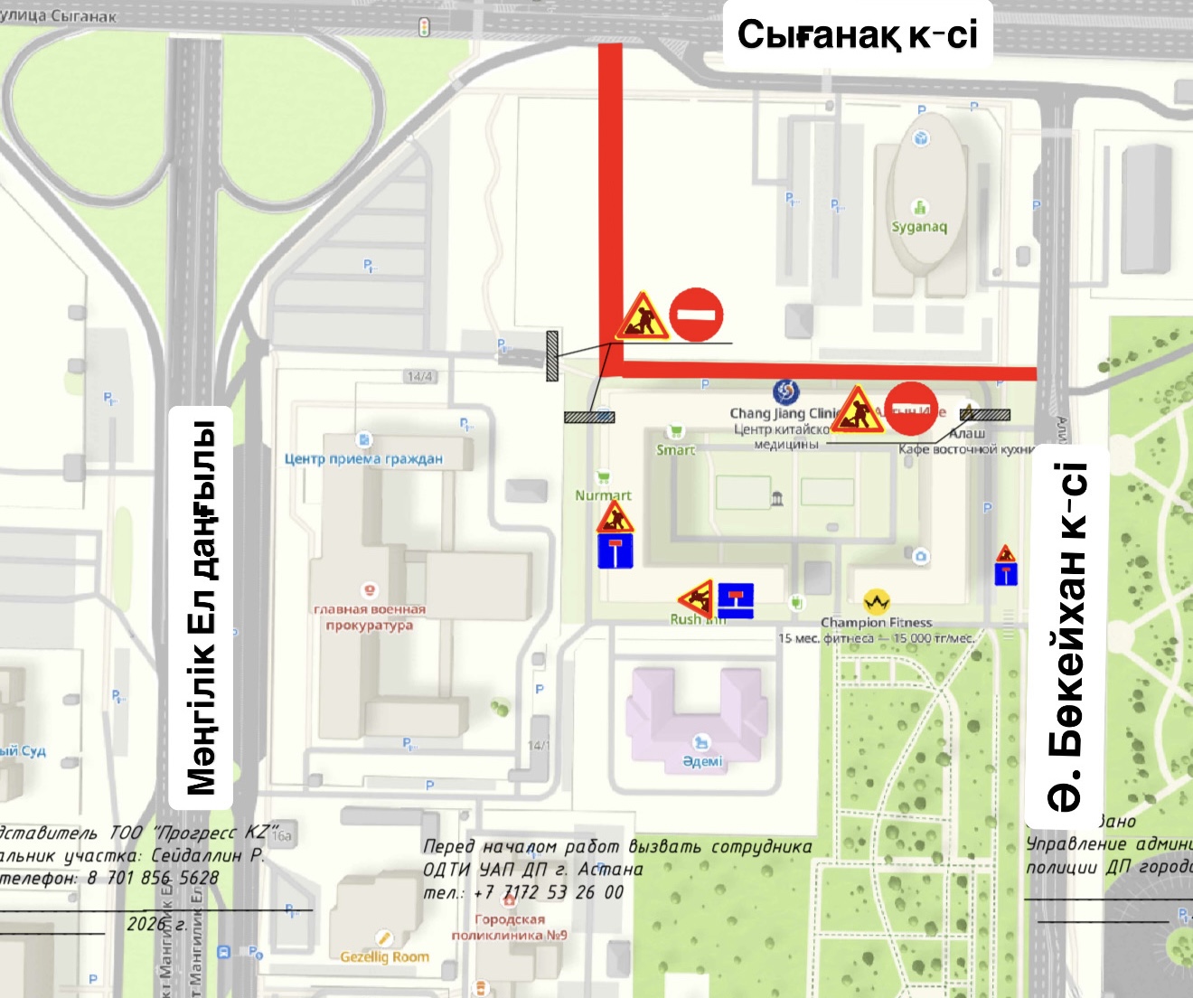 «Мәңгілік Ел даңғылы мен Сығанақ көшесінің қиылысында көшелерді салу» жобасын іске асыру аясында ағымдағы жылдың 26 сәуірі мен 1 қыркүйегі аралығында «Syganaq» БО мен «Ишим» ТК арасындағы қозғалыс толықтай жабылатын болады.