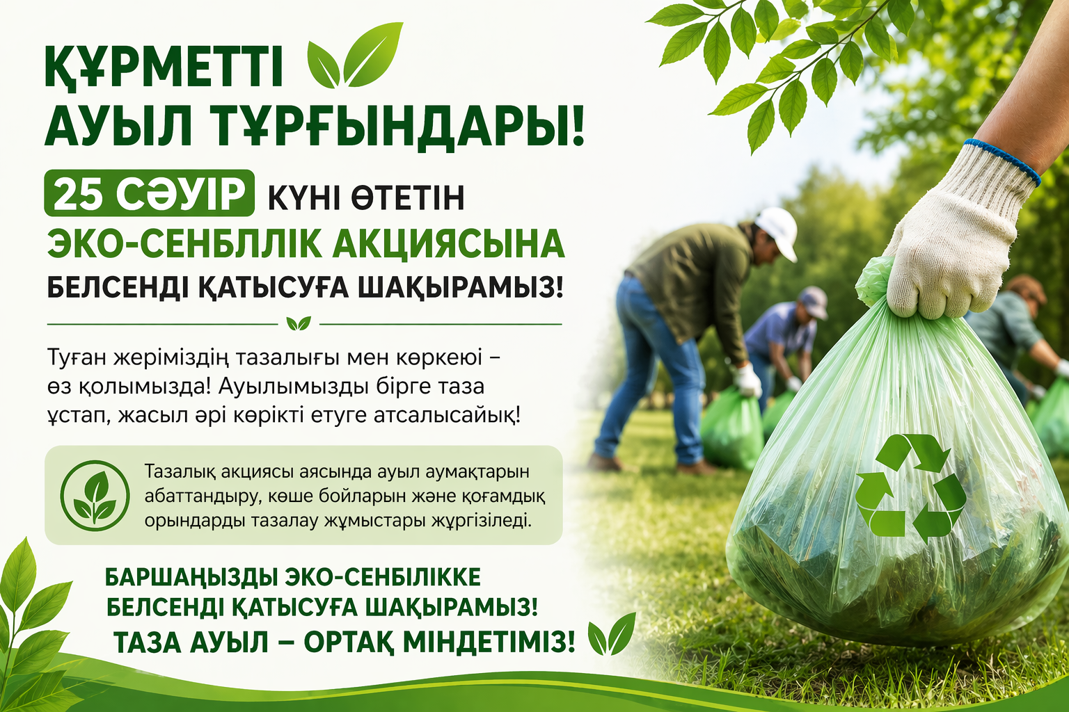 Осыған байланысты ауыл тұрғындарын аталған акцияға белсенді қатысуға шақырамыз.