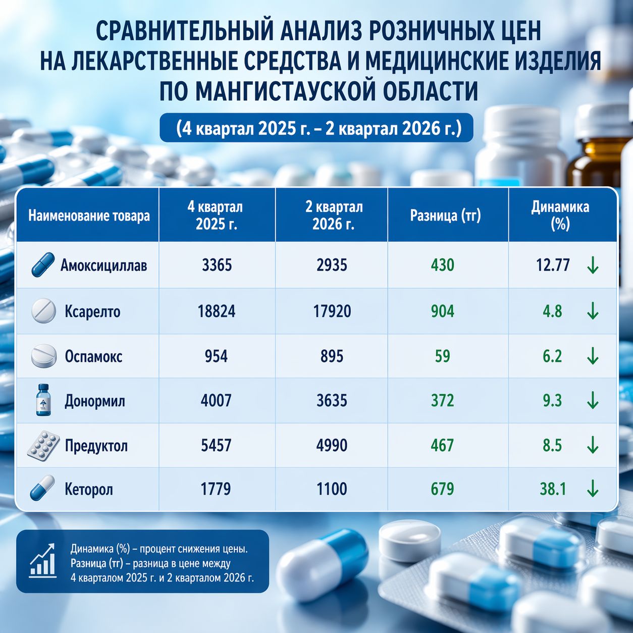 2025 жылдың IV тоқсанынан бастап 2026 жылдың II тоқсанына дейін Маңғыстау облысы Департаменті бойынша бөлшек саудада сатылатын дәрілік заттардың бағасына ай сайын мониторинг жүргізілді.