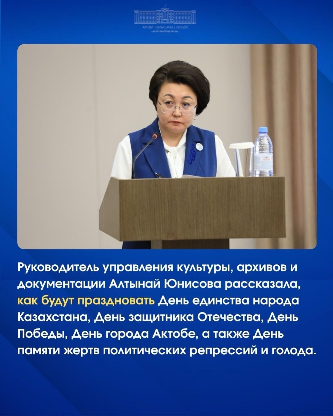 🔹 Облыс әкімі Асхат Шахаровтың төрағалығымен жиында мамыр айындағы мерекелік іс-шараларға дайындық және өткізу мәселесі қаралды. 📋 Мәдениет, архивтер және құжаттама басқармасының басшысы Алтынай Юнисова мамыр айындағы мерекелердің қалай атап өтілетінін баяндады. ✅ Іс-шараларды өткізу үшін кешенді жоспар бекітіліп, дайындық жұмыстары қарқынды жүргізілуде. 🌿 1 мамыр – Қазақстан халқының бірлігі күні облыстың елді мекендерінде атап өтіледі. Негізгі іс-шара «Қазақ халқына мың алғыс» стеласы маңында өтетін «Бірлікте біздің күш» мәдени-көпшілік бағдарламасы болмақ. 🛡️ 7 мамыр – Отан қорғаушылар күні. Негізгі іс-шаралар 6 мамырда Өнер орталығында өтеді. Мұнда «Ел қорғаны – ерлік рухы» атты мерекелік бағдарлама ұйымдастырылып, қала алаңдарында концерттер өтіп, ел дамуына үлес қосқан және патриотизм танытқан азаматтарды марапаттау рәсімдері болады. 🌹 9 мамыр – Жеңіс күні дәстүрлі түрде Ұлы Отан соғысы батырларының ескерткіштеріне гүл шоқтарын қоюмен басталады. Сондай-ақ еске алу және патриоттық акциялар, ардагерлермен кездесулер өтеді. 🎈 28 мамыр – Ақтөбе қаласының күніне айырықша назар аударылады.18–28 мамыр аралығында онкүндік бағдарлама өткізіледі. 🎤 28 мамыр күні кешкі сағат 18:00-ден бастап қаланың бес алаңында – Арбат алаңы, Қалалық мәдениет үйінде, Авиатор саябағында, Денсаулық саябағында және Есет батыр шағынауданында «Асқақтай бер, Ақтөбем!» атты концерттер өтеді. Ал сағат 20:00-де «Қазақ халқына мың алғыс» стеласы алдындағы алаңда гала-концерт ұйымдастырылады. 🕯️ Мамыр айындағы іс-шаралар 31 мамыр – саяси қуғын-сүргін және ашаршылық құрбандарын еске алу күнінде Түйетөбеде, 1930–1950 жылдардағы қуғын-сүргін құрбандарына арналған мемориалда, сондай-ақ «Азаттықтың ақ таңы» тарихи кешенінде және ашаршылық пен қуғын-сүргін құрбандарына арналған ескерткіште гүл шоқтарын қою рәсімдері өтеді. 💬 «Барлық мерекелер жоғары деңгейде өтуі тиіс. Оларды жастардың тарихқа деген құрметін, патриотизмін және ел болашағына деген жауапкершілігін қалыптастыратын мазмұнмен толықтыру маңызды», – деді Асхат Шахаров.
