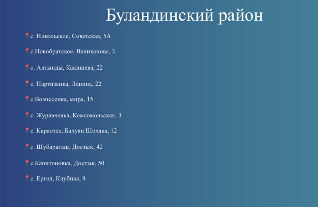 Ақмола облысының шалғайдағы елді мекендердің тұрғандарына құқықтық көмек алу, құқықтық сауаттылықты арттыру, қолданыстағы нормативтік құқықтық актілермен танысу мүмкіндігін жасау мақсатында ашылған “Құқық кабинеттерінің тізімі”