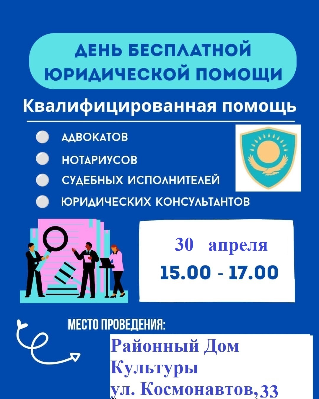 Білікті заң көмегін адвокаттар, нотариустар, заң консультанттары, мемлекеттік және жеке сот орындаушылар және Қарабалық аудандық сотының төрағасы көрсетеді. Аудандық аурухананың бас дәрігерінің м.а., жұмыспен қамту және әлеуметтік бағдарламалар бөлімінің басшысы, тұрғын үй-коммуналдық шаруашылық бөлімінің басшысынан консультациялық көмек.