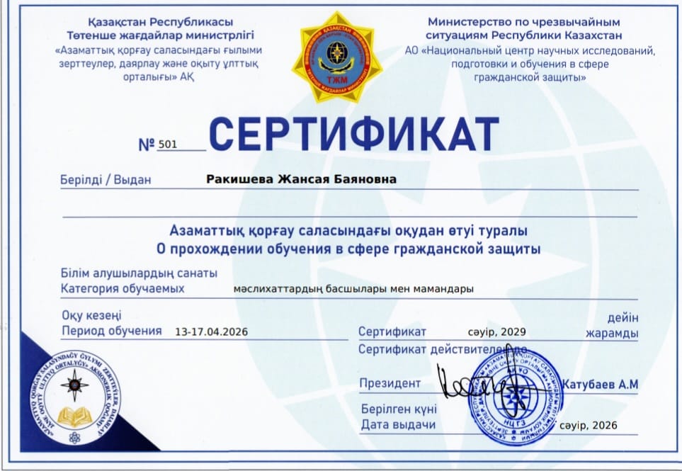 Семей қаласы мәслихаты аппаратының ұйымдастыру жұмысы бөлімінің басшысы Жансая Ракишева Алматы қаласында Қазақстан Республикасы Төтенше жағдайлар министрлігінің жанындағы «Азаматтық қорғау саласындағы ғылыми зерттеулер, даярлау және оқыту ұлттық орталығы» акционерлік қоғамының базасында оқудан өтті.
