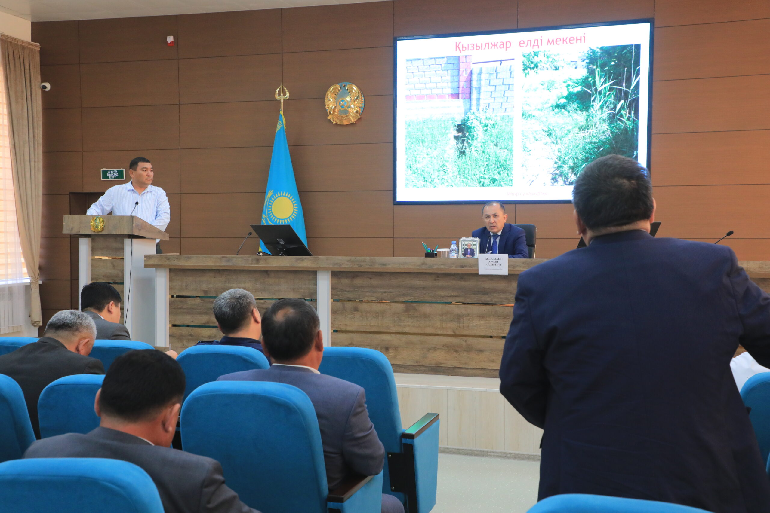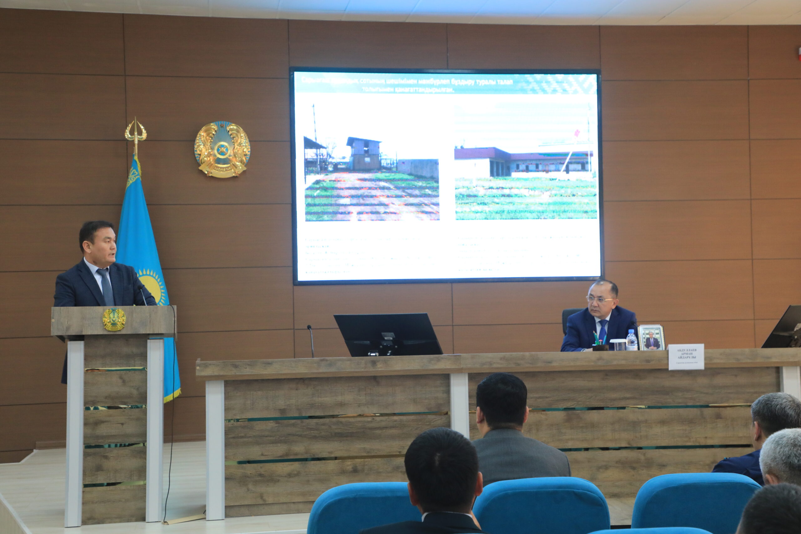 Алғашқы мәселе бойынша аудандағы құрылыс нысандарының қазіргі жай-күйі, сондай-ақ заңсыз салынған құрылыстарды анықтау және оларды ретке келтіру жұмыстары туралы аудандық құрылыс, сәулет және қала құрылысы бөлімінің басшысы Ерғали Қосмұратов баяндама жасады. Ол өз сөзінде жүргізіліп жатқан бақылау және реттеу шараларына тоқталды.
